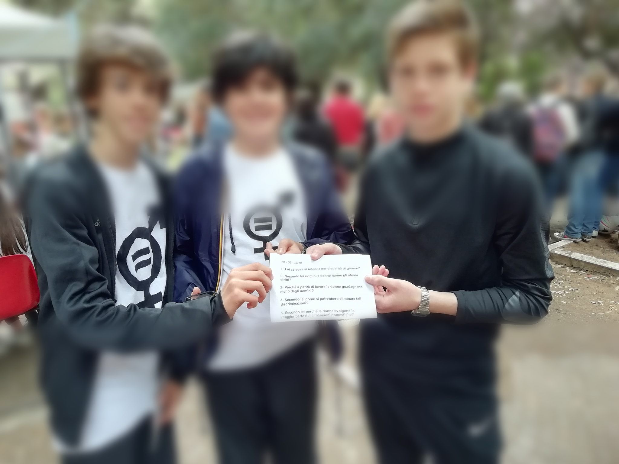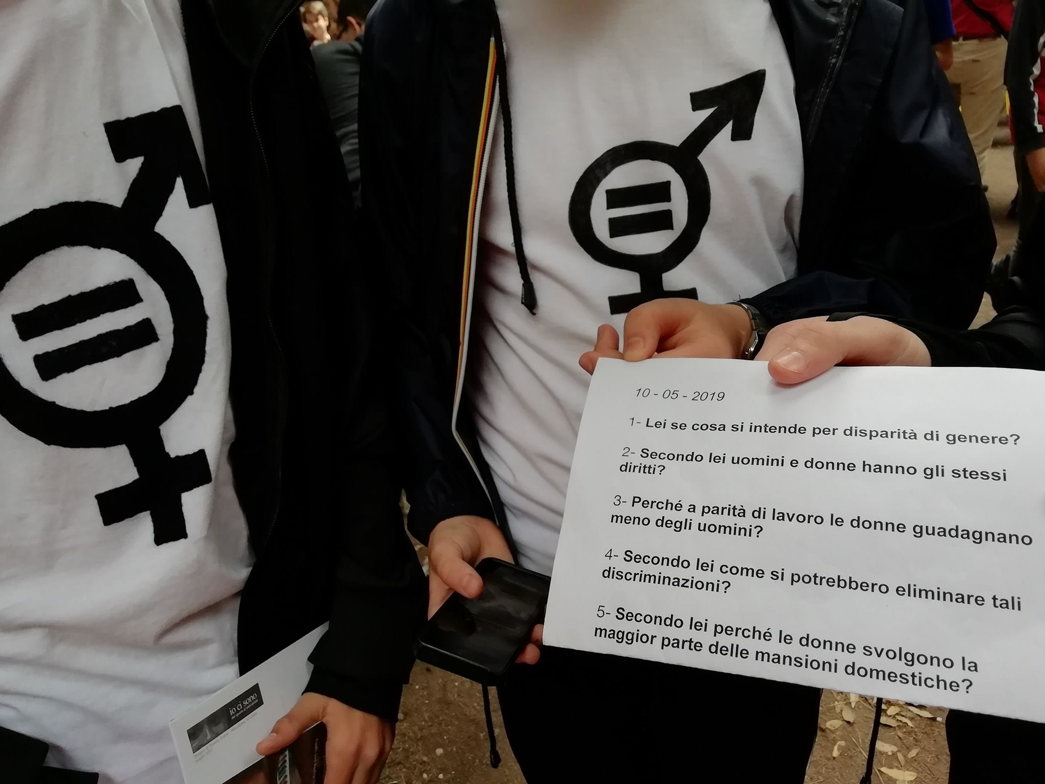 Mi ha divertito il loro coinvolgimento, ho apprezzato molto il fatto che ad esempio abbiano proposto loro di fare le interviste. A un certo punto dovevamo pensare ad un’attività per la Festa del Libro che la nostra scuola organizza ogni anno. Abbiamo pensato varie cose, tra cui fare un disegno su una maglietta, abbiamo scelto il logo ecc., e poi loro hanno proposto di intervistare i passanti sui temi delle disugaglianze di genere. È stata un’iniziativa degli alunni e delle alunne. L’abbiamo preparata, ovviamente, perché tutte queste attività in realtà fanno parte poi della mia programmazione, nel senso che preparare un’intervista vuol dire fare un esercizio di italiano, di lingua, e quindi è comunque qualcosa che è inerente al programma. Al ritorno a scuola abbiamo commentato tutte queste risposte: chi ha risposto, chi non ha risposto, chi ha saputo rispondere, chi non sapeva che cosa fosse la disuguaglianza di genere. Insomma, è stata una cosa divertente anche.