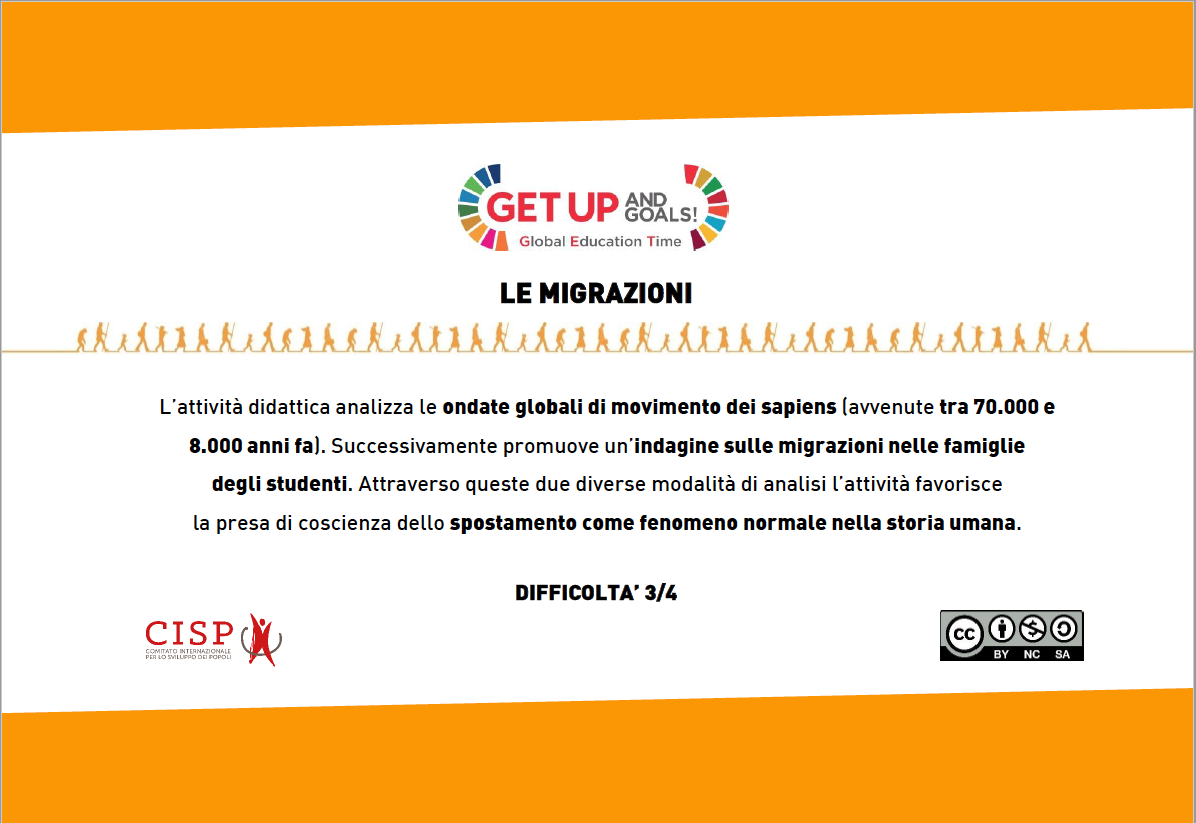 L’attività didattica analizza le ondate globali di movimento dei sapiens (avvenute tra 70.000 e 8.000 anni fa). Successivamente promuove un’indagine sulle migrazioni nelle famiglie degli studenti. Attraverso queste due diverse modalità di analisi l’attività favorisce la presa di coscienza dello spostamento come fenomeno normale nella storia umana.