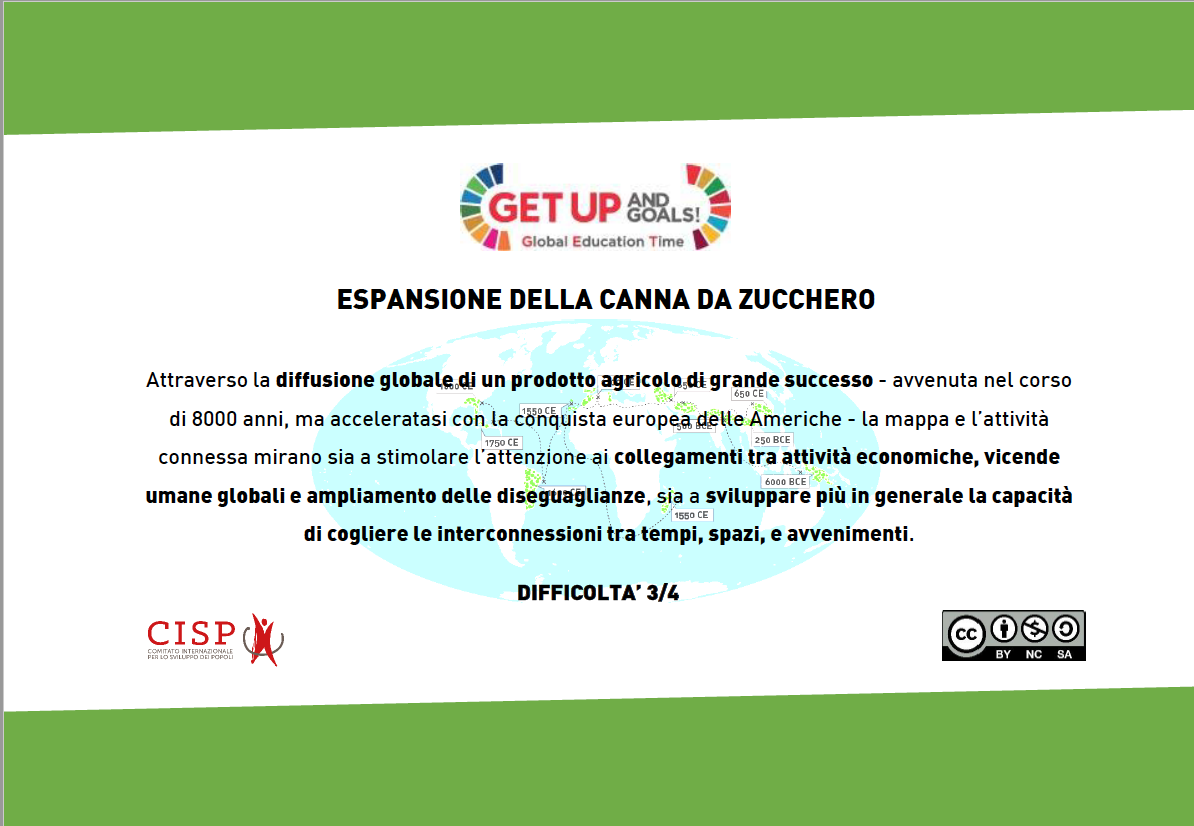 Attraverso la diffusione globale di un prodotto agricolo di grande successo - avvenuta nel corso di 8000 anni, ma acceleratasi con la conquista europea delle Americhe - la mappa e l’attività connessa mirano sia a stimolare l’attenzione ai collegamenti tra attività economiche, vicende umane globali e ampliamento delle diseguaglianze, sia a sviluppare più in generale la capacità di cogliere le interconnessioni tra tempi, spazi, e avvenimenti.