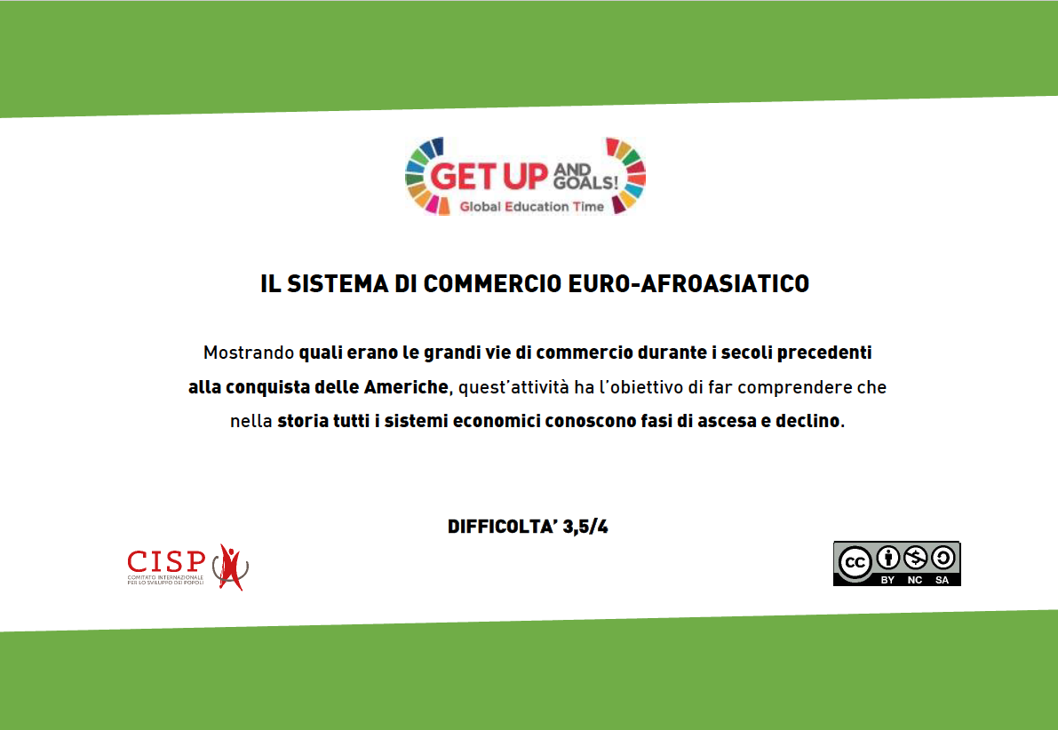Mostrando quali erano le grandi vie di commercio durante i secoli precedenti alla conquista delle Americhe, quest’attività ha l’obiettivo di far comprendere che nella storia tutti i sistemi economici conoscono fasi di ascesa e declino.