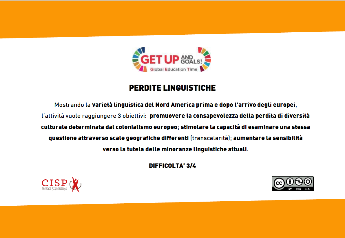 Mostrando la varietà linguistica del Nord America prima e dopo l’arrivo degli europei, l’attività vuole raggiungere 3 obiettivi: promuovere la consapevolezza della perdita di diversità culturale determinata dal colonialismo europeo; stimolare la capacità di esaminare una stessa questione attraverso scale geografiche differenti(transcalarità); aumentare la sensibilità verso la tutela delle minoranze linguistiche attuali.