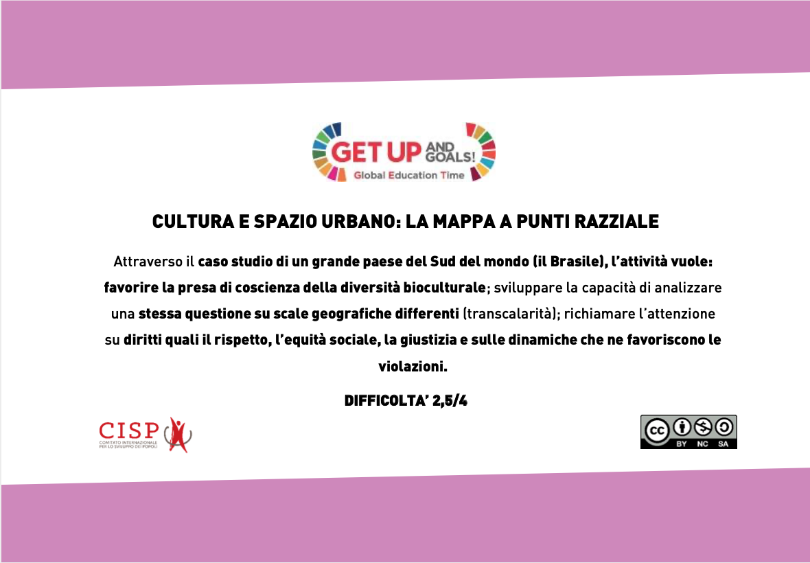 Attraverso il caso studio di un grande paese del Sud del mondo (il Brasile), l’attività vuole: favorire la presa di coscienza della diversità bioculturale; sviluppare la capacità di analizzare una stessa questione su scale geografiche differenti (transcalarità); richiamare l’attenzione su diritti quali il rispetto, l’equità sociale, la giustizia e sulle dinamiche che ne favoriscono le violazioni.