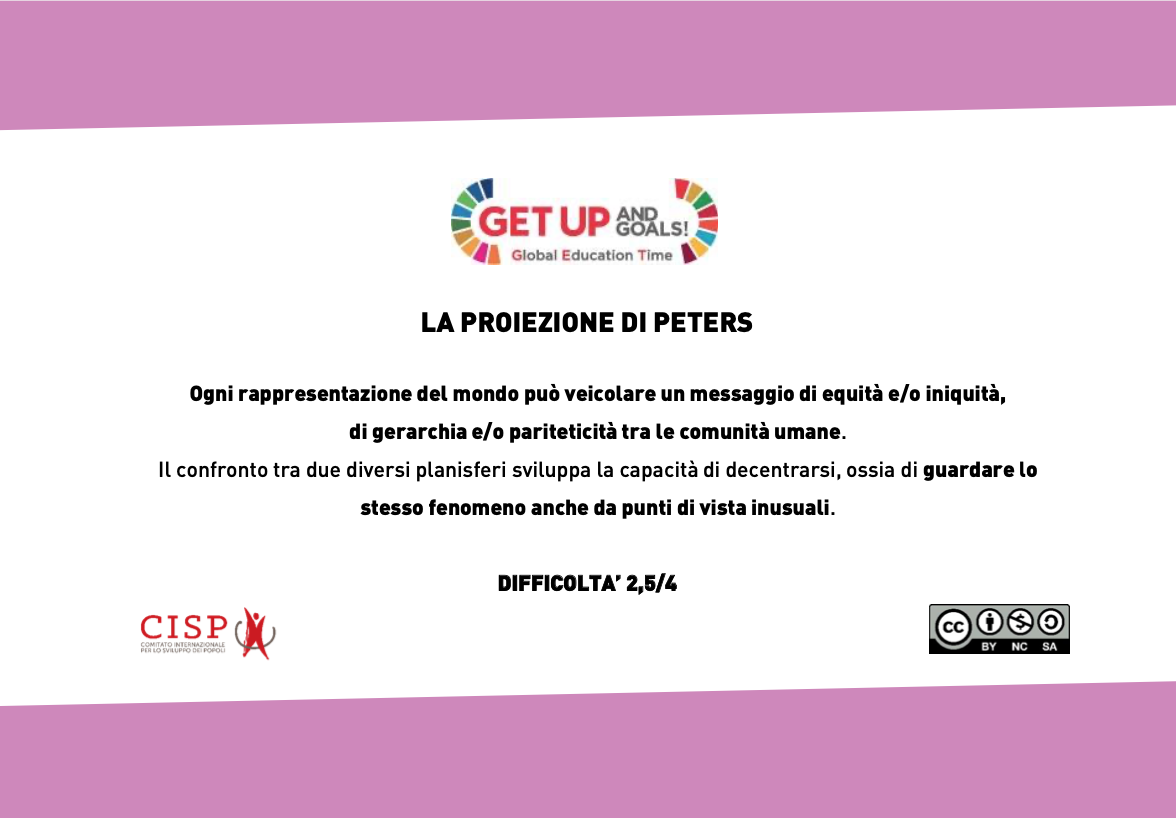 Ogni rappresentazione del mondo può veicolare un messaggio di equità e/o iniquità, di gerarchia e/o pariteticità tra le comunità umane. Il confronto tra due diversi planisferi sviluppa la capacità di decentrarsi, ossia di guardare lo stesso fenomeno anche da punti di vista inusuali.